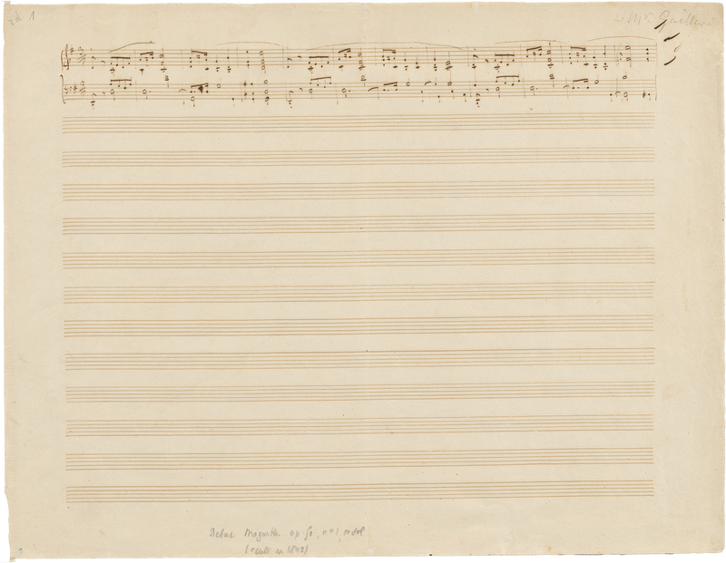 萧邦G大调马祖卡作品50号第1首手写曲谱,1842年,纸本,墨水,22×28.7cm,珍藏机构:波兰萧邦钻研院、萧邦博物馆。