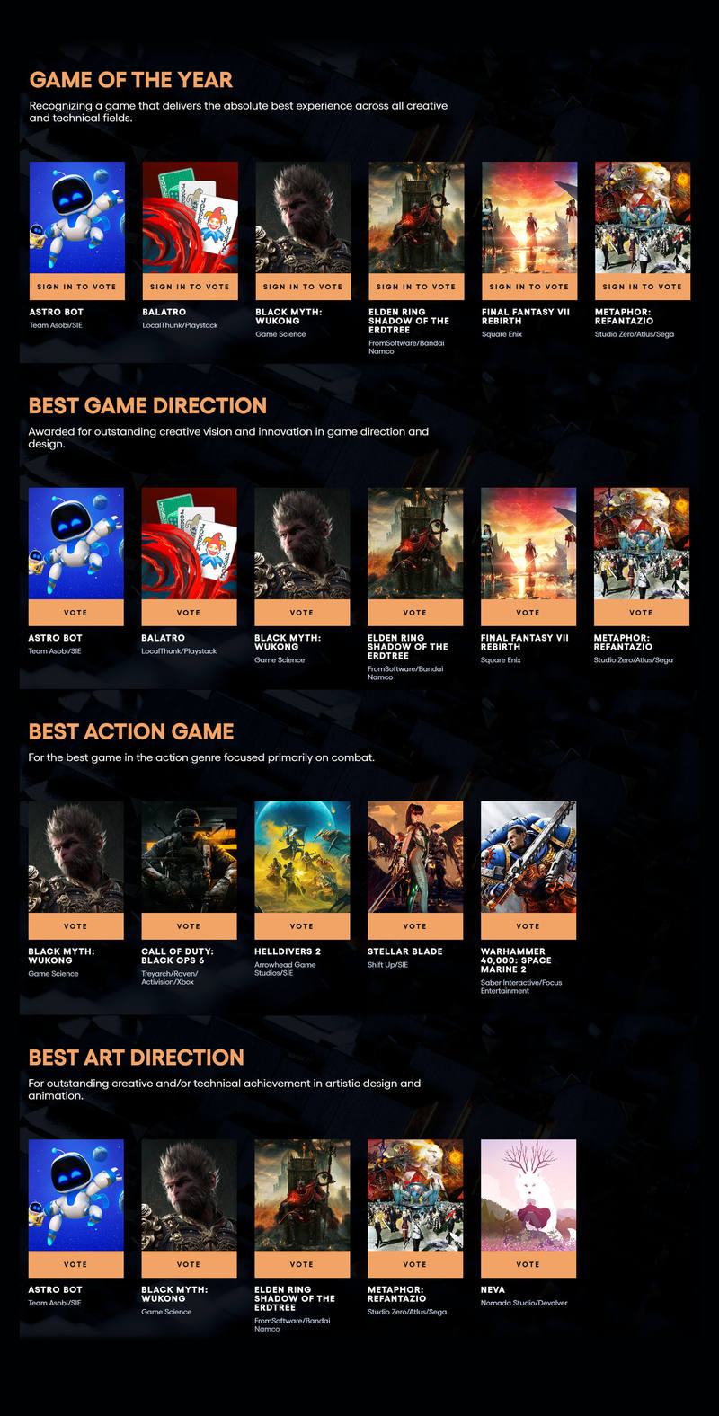 同样取患上年度最佳游戏提名的卡项尚有《宇宙机械人》《小丑牌》《艾尔登法环:黄金树幽影》《最终妄想7:新生》《暗喻妄想:ReFantazio》等作品。