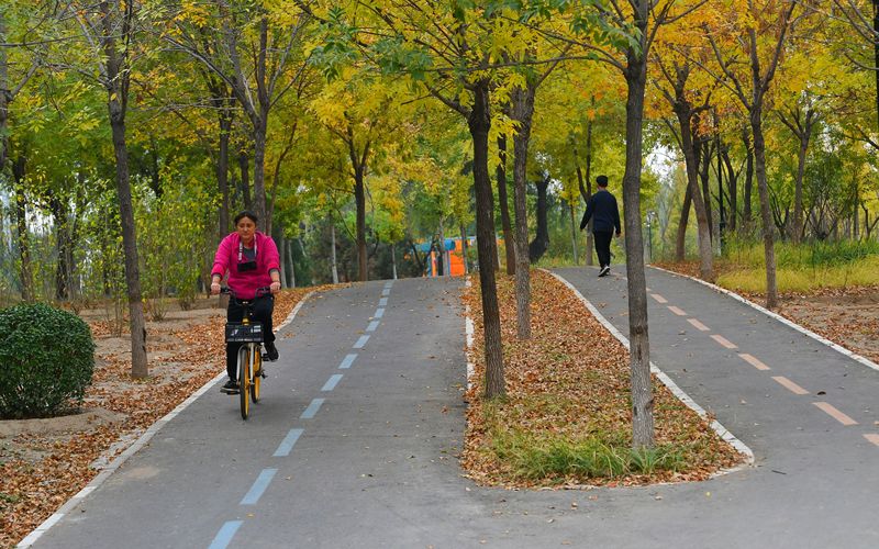 10月20日,望以及公园北园骑行绿道双侧树叶变黄,骑行喜爱者一起秋色相伴。最新往事记者 王贵彬 摄