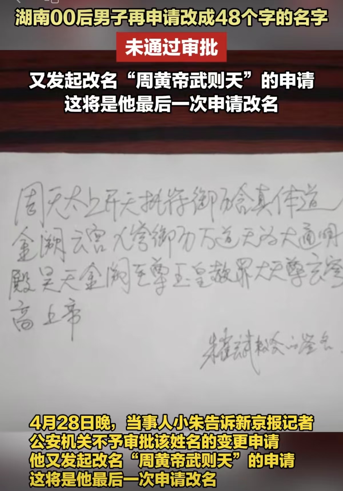 ▲湖南“00后”男生朱雀玄武命令的更名闹剧激发了行动关注。图/最新往事视频截图