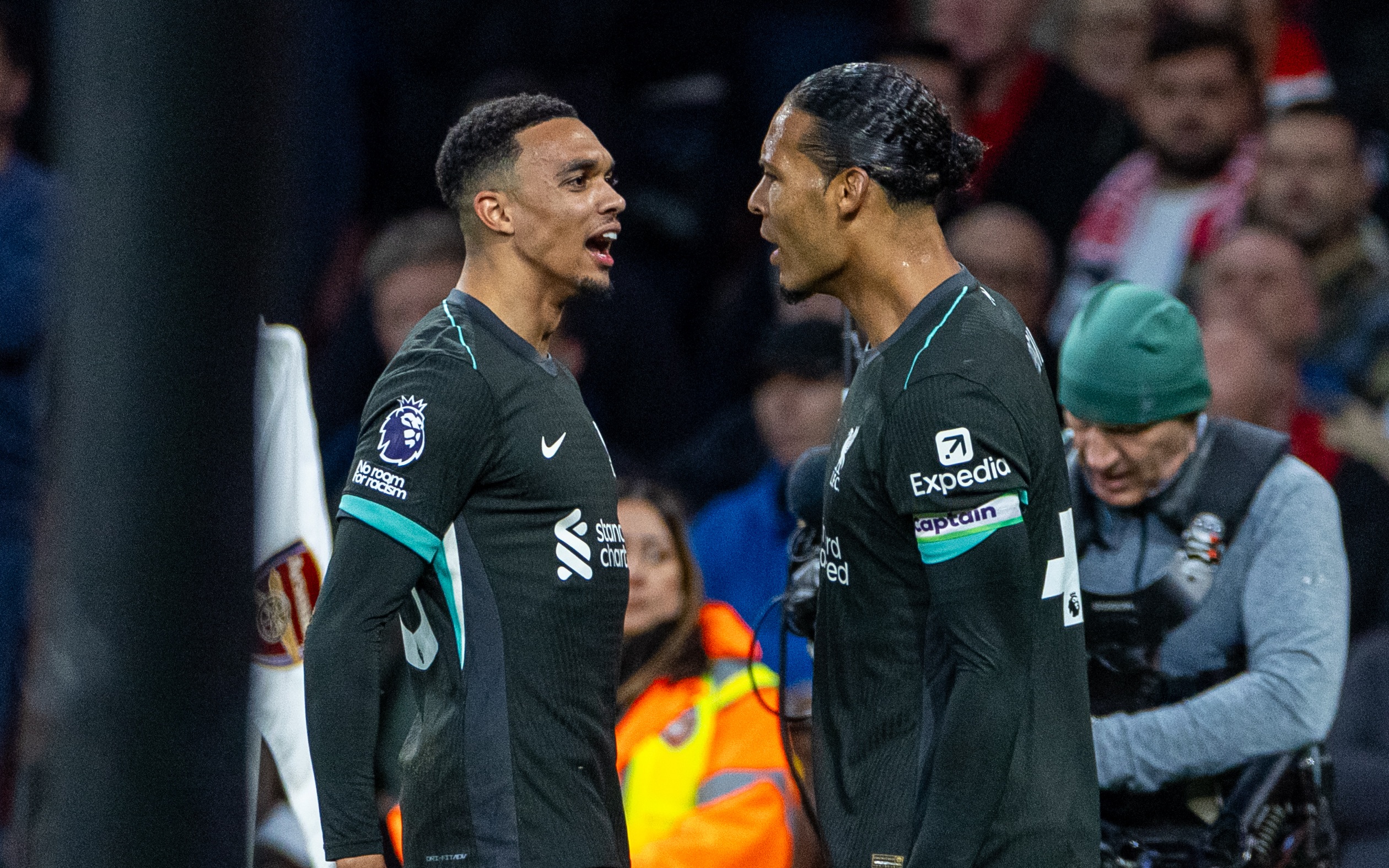 利物浦后卫范戴克(右)进球后与队友阿诺德贺喜。 图/新华网