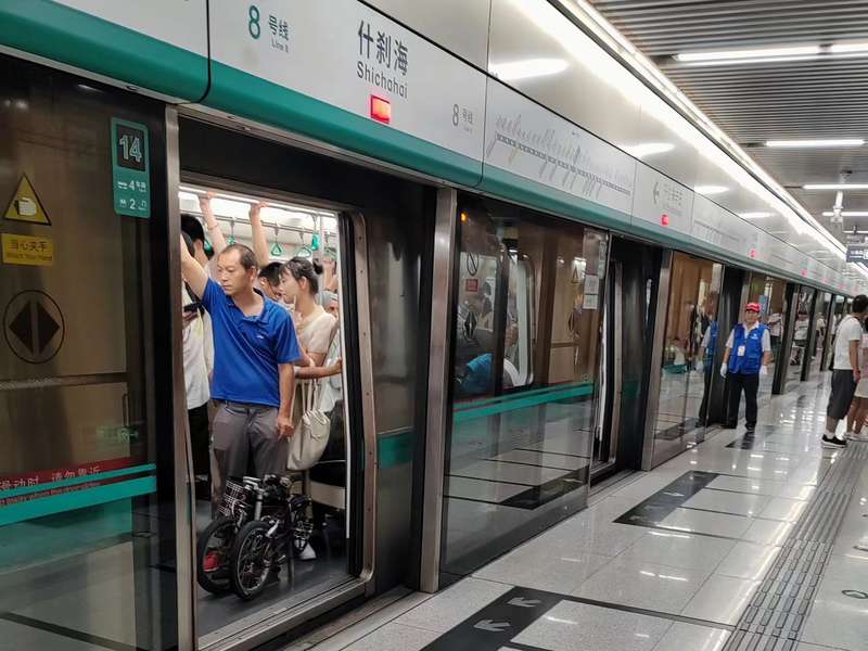 在地铁5号线天坛东门站,由于进入暑期,临远景区的车站内客流量相对于较大,地铁使命职员要求记者将自行车折叠好后,便应承进站搭车,全副历程颇为顺遂。