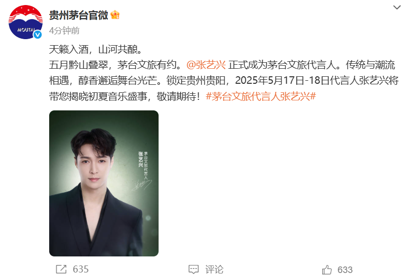 贵州茅台官微宣告张艺兴正式成为茅台文旅代言人。图/贵州茅台官微截图