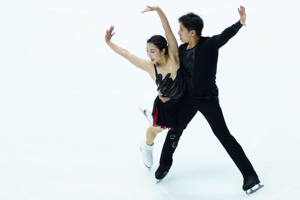 11月7日,中国组合隋娴静(左)/韩聪在双人滑短节目角逐中。赛隋首日事他们以74.63分的娴静新往下场位列第一位。新华网记者 贾浩成 摄