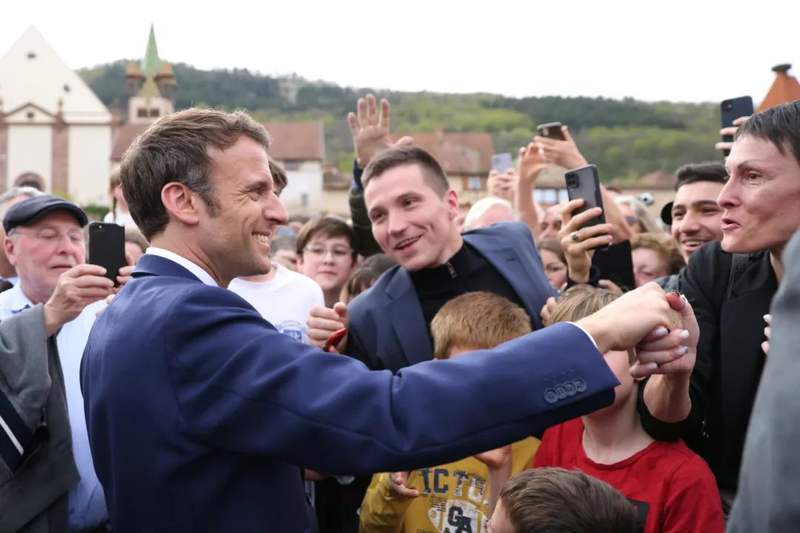 当地光阴2022年4月12日,法国总统马克龙,在法国斯特拉斯堡临近拦阻竞选碰头时与居夷易近握手。图/IC photo