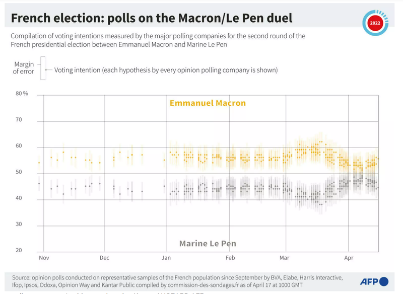 法国总统推选第二轮投票前的夷易近调数据。 法新社报道截图