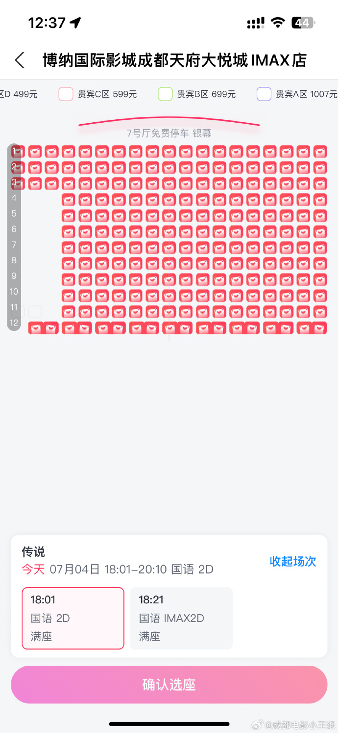 据猫眼购票平台揭示,7月4日,演片片子《传说》成都某影院的票被一场路演中,票价在499元-1007元不等。别把