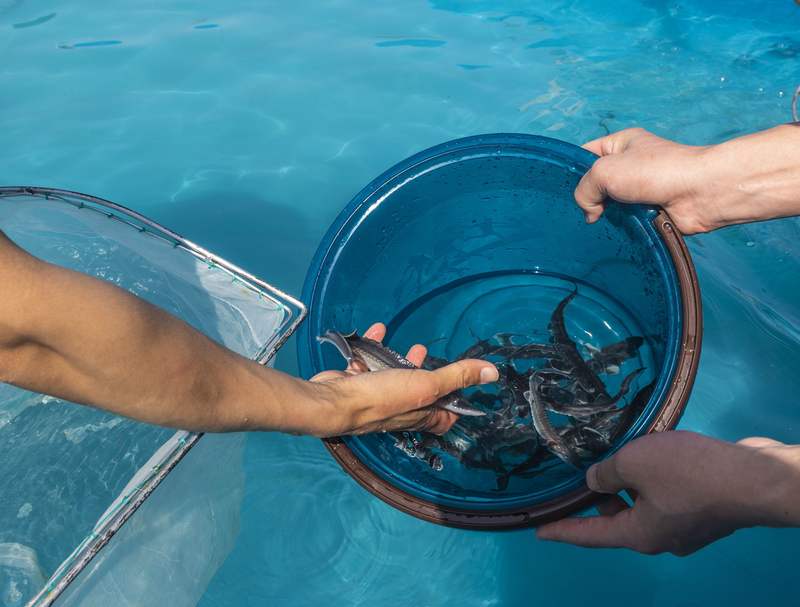 2022年4月9日,在湖北省宜昌市胭脂园长江珍稀鱼类放流点,工巨匠员在磨难即将放流的中华鲟。图/IC photo
