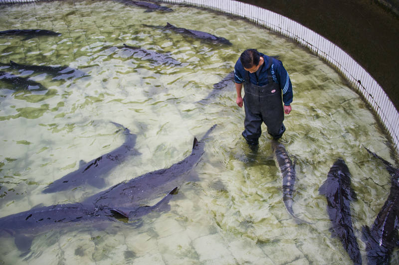 2019年1月12日,长江水产钻研所中华鲟试验基地的工人在中华鲟露天养殖池中做清洁使命。图/IC photo