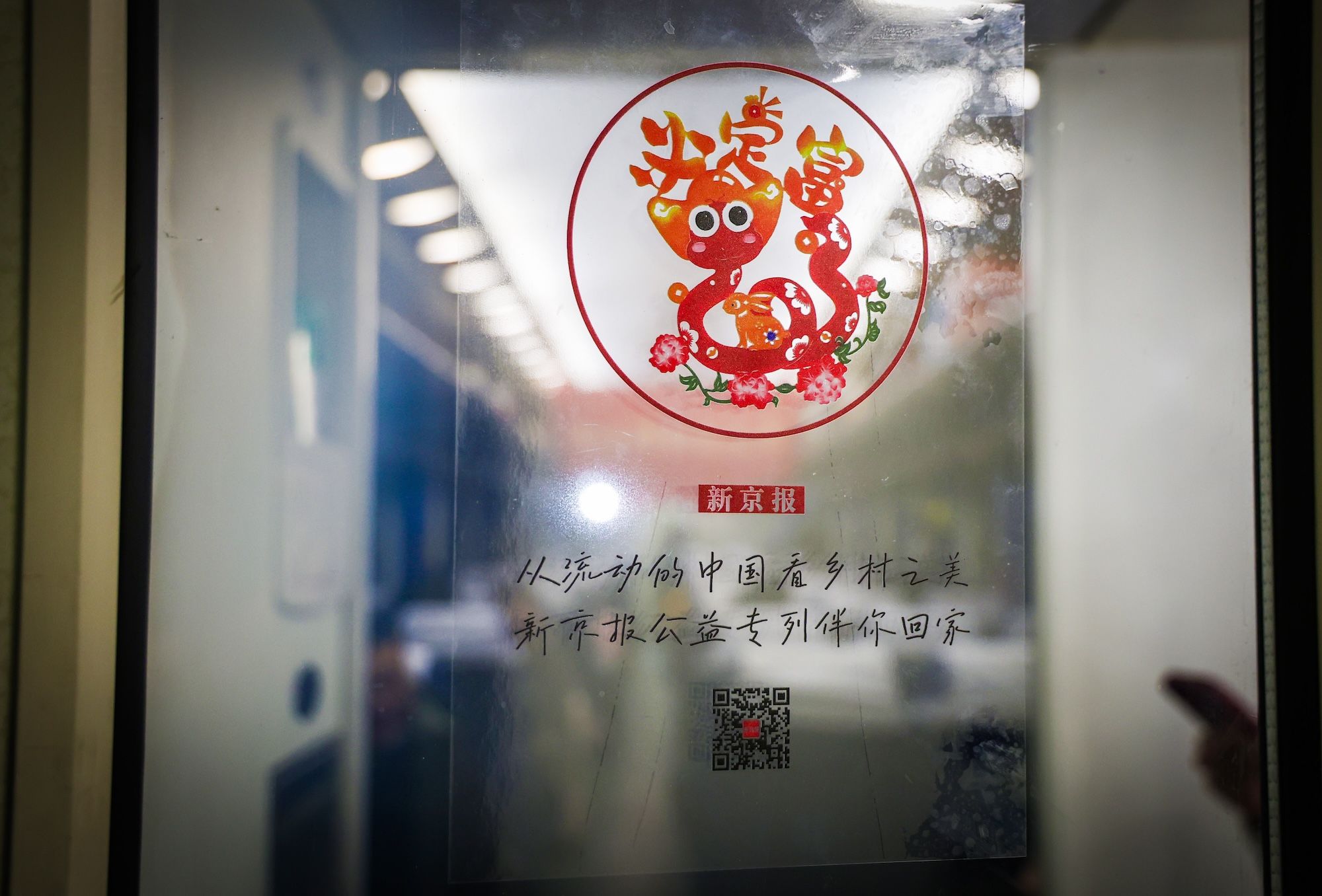 6437北京西至大涧公益专列,车窗上贴着新春窗花拆穿。