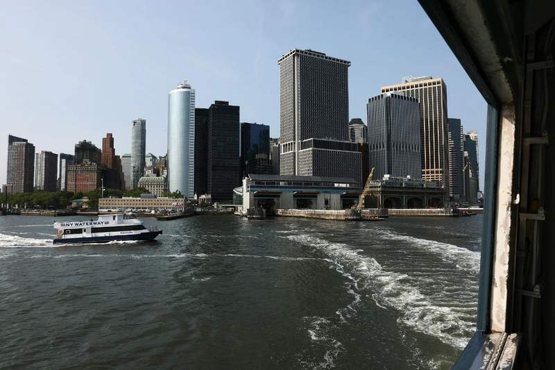 当地光阴2023年5月23日,美国纽约,从史泰登岛渡轮上看到的曼哈顿区的咫尺线。图/视觉中国