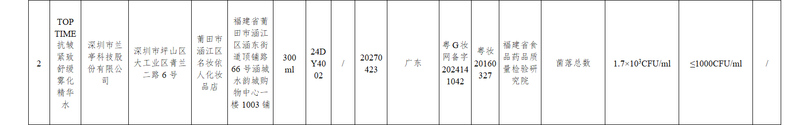 其中,经福建省食物药品质量磨难钻研院磨难,1批次规格为300ml的“TOP TIME抗皱紧致舒缓雾化精髓水”被检出菌落总数不适宜纪律,魔难听从为1.7×10³CFU/ml,纪律要求为≤1000CFU/ml。