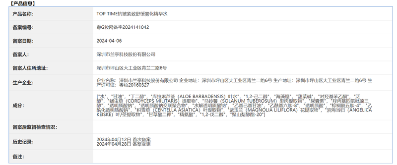 最新往事贝壳财经记者查问国产艰深化装品存案信息懂取患上,该产物的存案编号为“粤G妆网备字2024141042”,存案日期是2024年4月6日,存案人以及破费企业均为深圳市兰亭科技股份有限公司。