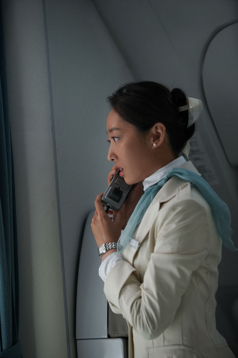 蒋梦婕在影片《惊险航线》中饰演凋敝舍身的空姐菲安娜。