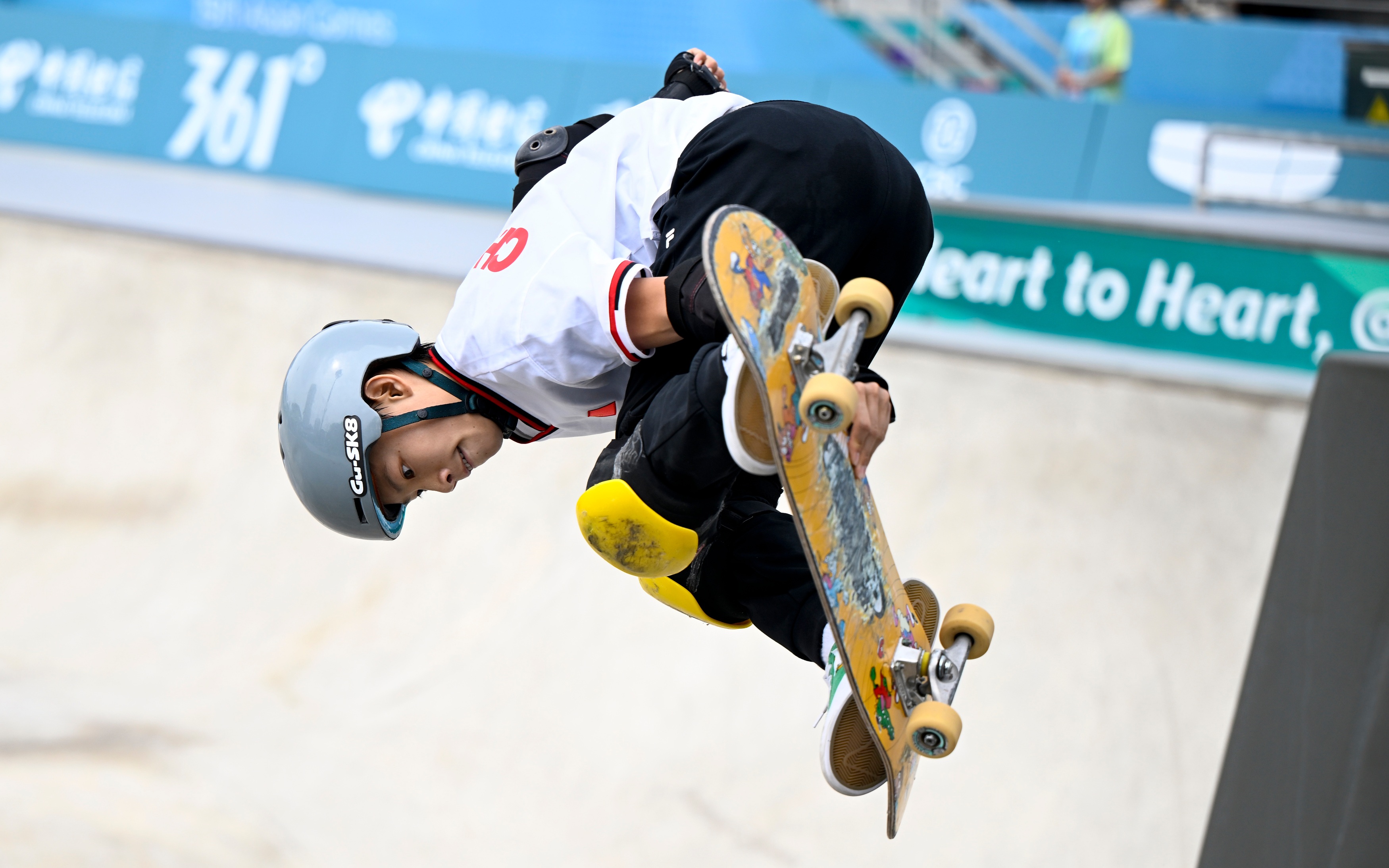 15岁的陈烨摘下杭州亚运会女子碗池金牌,为中国滑板队取患上突破。为建往事 图/新华网
