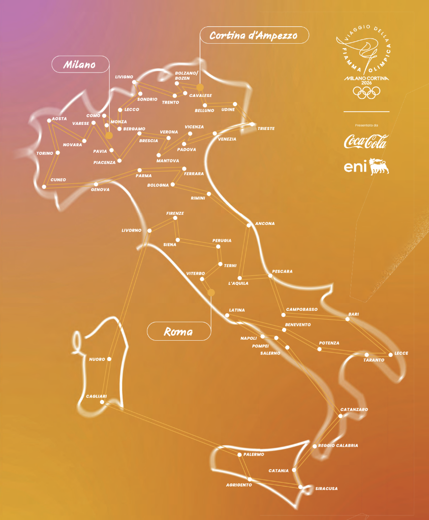 △米兰冬奥会火炬在意大利境内的传递道路图。图源:米兰冬奥组委