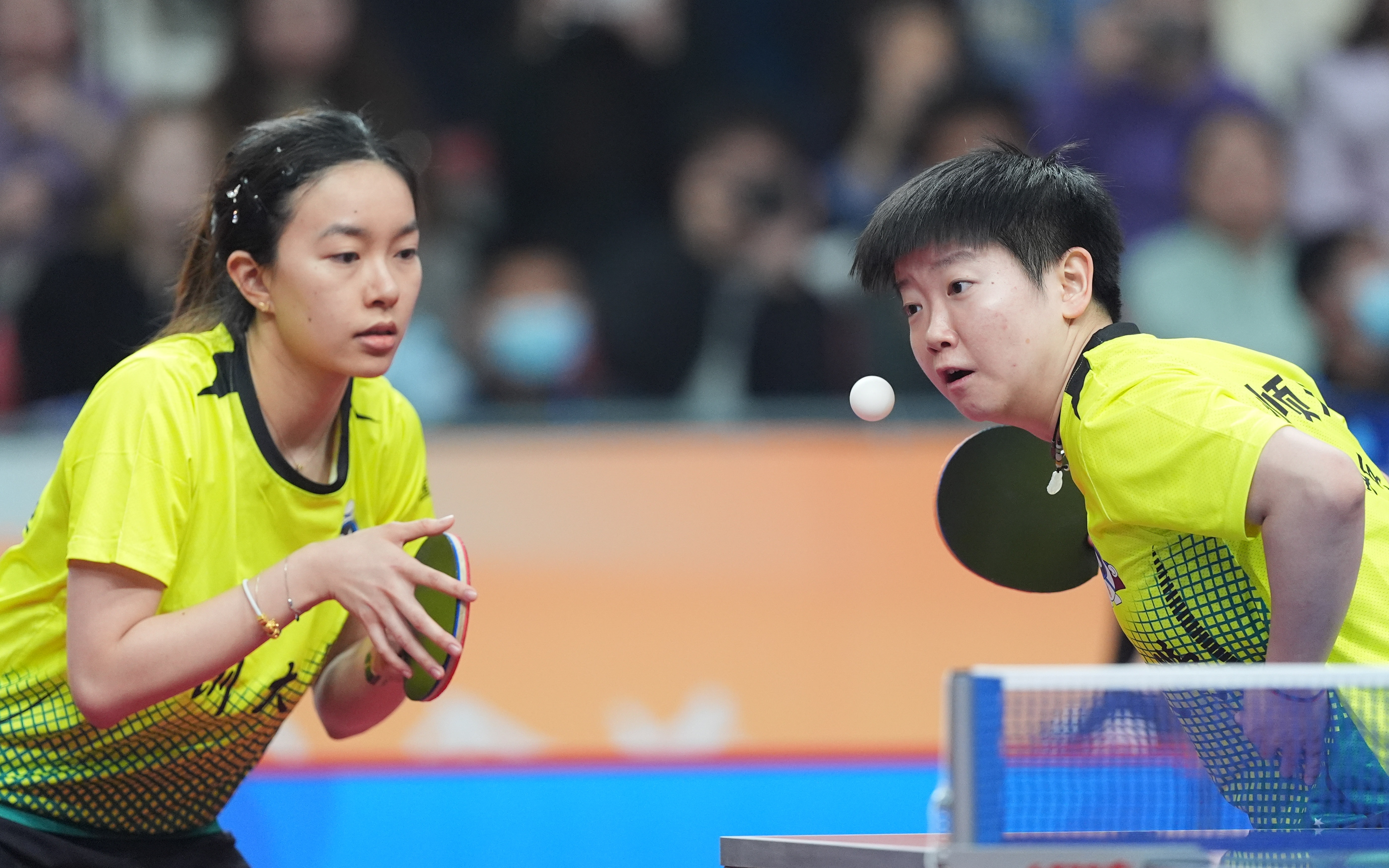 深圳大学队组合孙颖莎(右)/吴咏琳出战女子总体双打角逐。 图/新华网