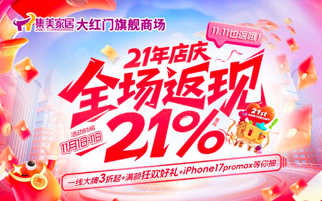 此番21年店庆,集美家居大红门旗舰商场为破费者带来一系列力度空前的优惠行动。其中,11月1日至11日在商场购物满1000元的主顾,交清全款后均可享受购物直返现金优惠,最高立返21%。多买多返,单笔定单最高立返10000元。行动时期,实付满2000元即可退出满额换好礼行动,礼物收罗红酒单支、清水器、低压锅等好物,多买多赠。11月1日至9日,主顾在集美家居大红门旗舰商场购物实付满1000元,可取患上最终抽奖券1张,2000元患上2张,以此类推上不封顶。凭抽奖券可退出抽奖,赢取iPhone 17 Pro Max等惊喜大奖。