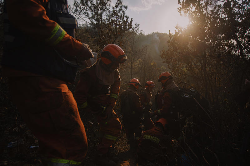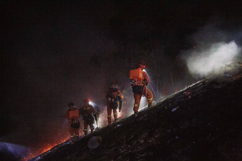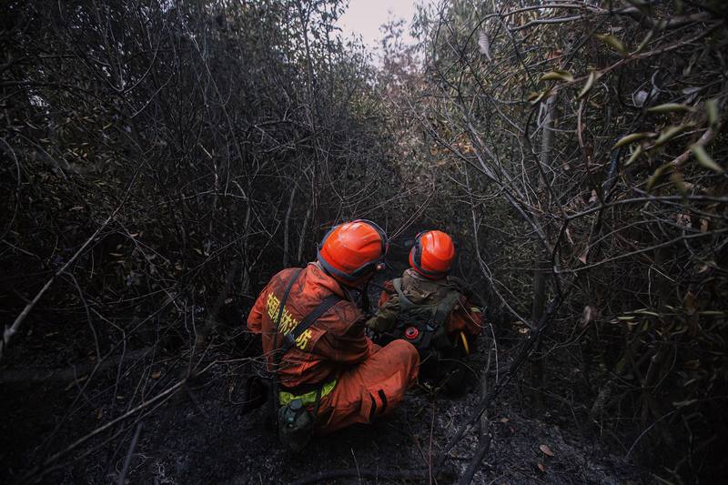 2022年3月18日,云南大理,凤仪火场北线,云南省森林消防总队普洱支队的消防员们收工下山。