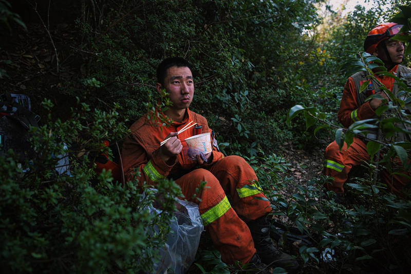 2022年3月18日,云南大理,凤仪火场北线,云南省森林消防总队普洱支队的消防员一边吃午饭,一边审核着山扑面的烟点。