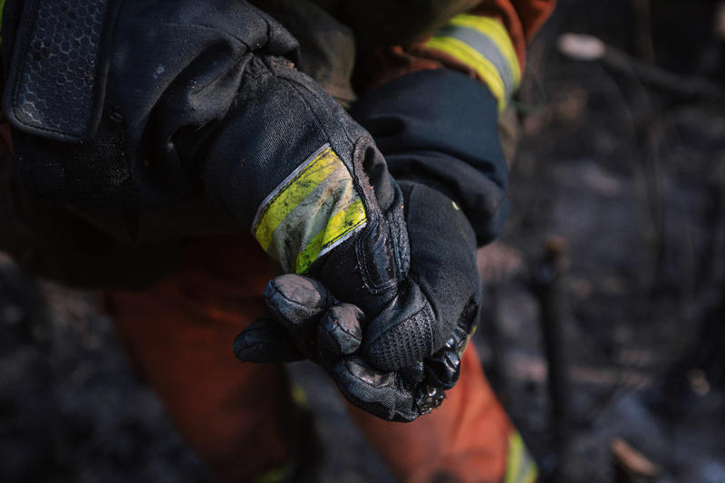 2022年3月18日,云南大理,凤仪火场北线,云南省森林消防总队普洱支队的消防员在处置完一处烟点后挤掉手套上的水。