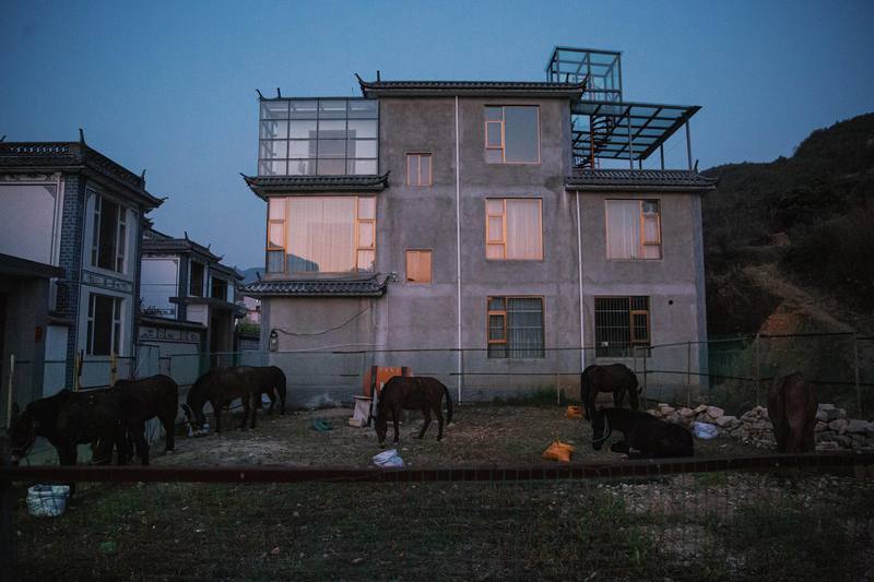 2022年3月18日,云南大理上乐以及村落子,临近村落子子凑来运物资的骡子。