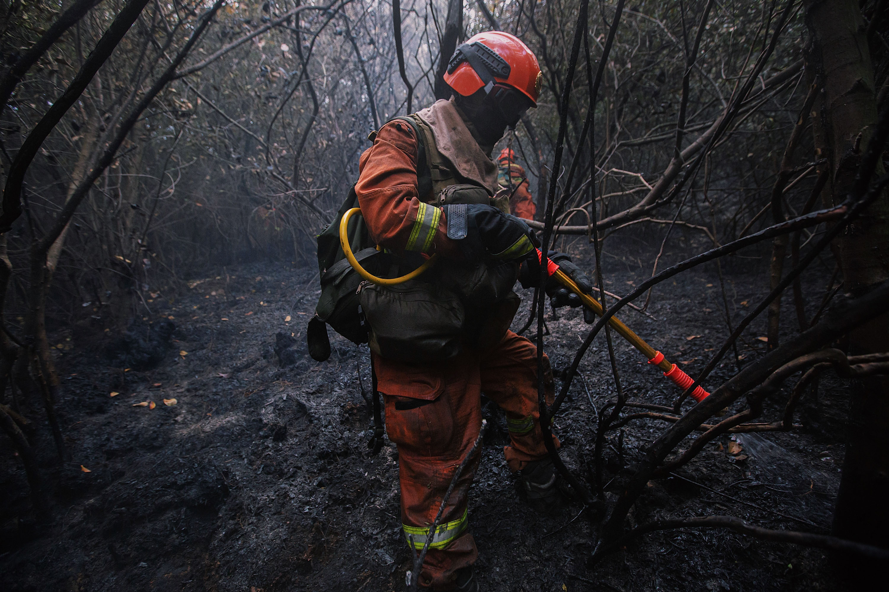 2022年3月18日,云南大理,凤仪火场北线,云南省森林消防总队普洱支队的消防员提着水朝一处火点走去,山势峻峭,他的脚底不断打滑。