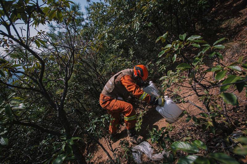 2022年3月18日,云南大理,凤仪火场北线,云南省森林消防总队普洱支队的消防员为喷水配置装备部署装备部署加水。