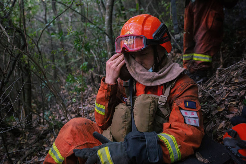 2022年3月18日,云南大理,凤仪火场北线,云南省森林消防总队普洱支队的消防员在处置完一处烟点后擦拭自己脸上的灰。