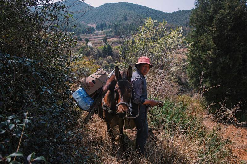 2022年3月18日,云南大理,上乐以及村落子通往凤仪火场北线的山路,村落子夷易近牵着骡子将物资运上山。
