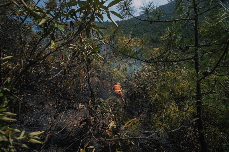 2022年3月18日,云南大理,凤仪火场北线,云南省森林消防总队普洱支队的消防员对于一处烟点拦阻整理,防止烟点复燃。