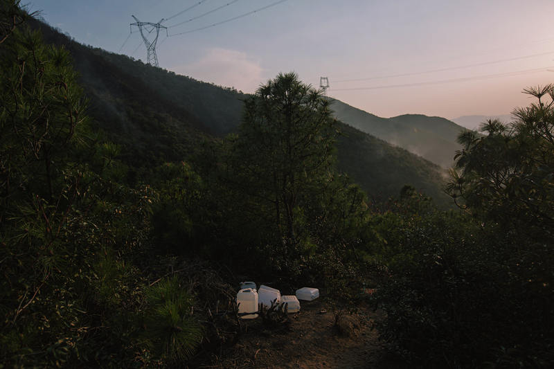 2022年3月18日,云南大理,凤仪火场北线,一棵树下的灭火用水。这些水都是村落子夷易近从山下徒步2个多小时背上来的,弥足珍贵。