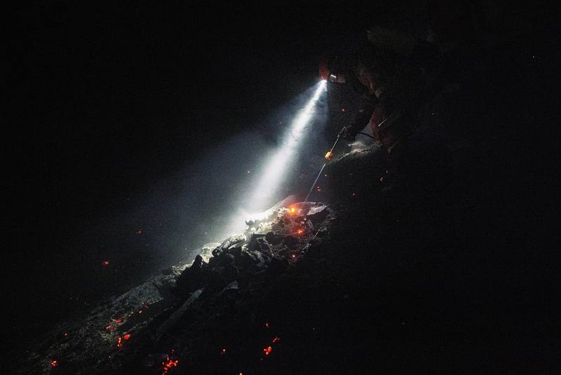 2022年3月17日深夜,云南大理,凤仪火场南线,云南省森林消防总队昆明支队的消防员们对于一处烟点拦阻处置,防止烟点复燃。