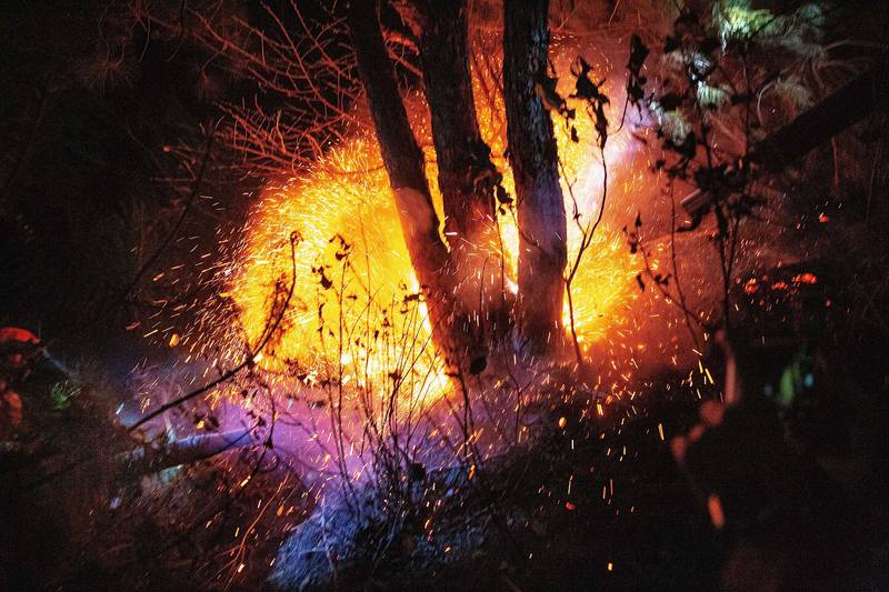 2022年3月17日深夜,云南大理,凤仪火场南线,云南省森林消防总队昆明支队的消防员用风力灭火机拦阻扑火。