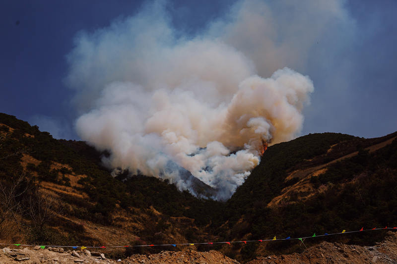 2022年3月17日,云南大理,凤仪火场南线浓烟滔滔,扑火队在山下开出了克制带。