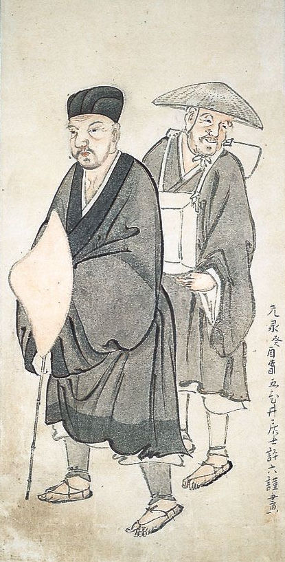 《奥州小道行脚图》,芭蕉(左)与已经良。森川许六画作。