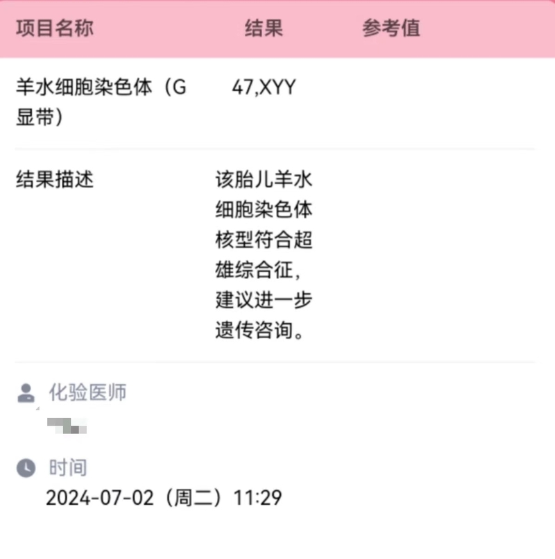 从做羊水穿刺到最开幕果进去,一共过了三周。这是郑秋感应人生中最杂乱的三周,她抱着一丝侥幸神思,祈祷磨难可能翻盘,但最开幕果让郑秋意气飞腾——“47,XYY”。