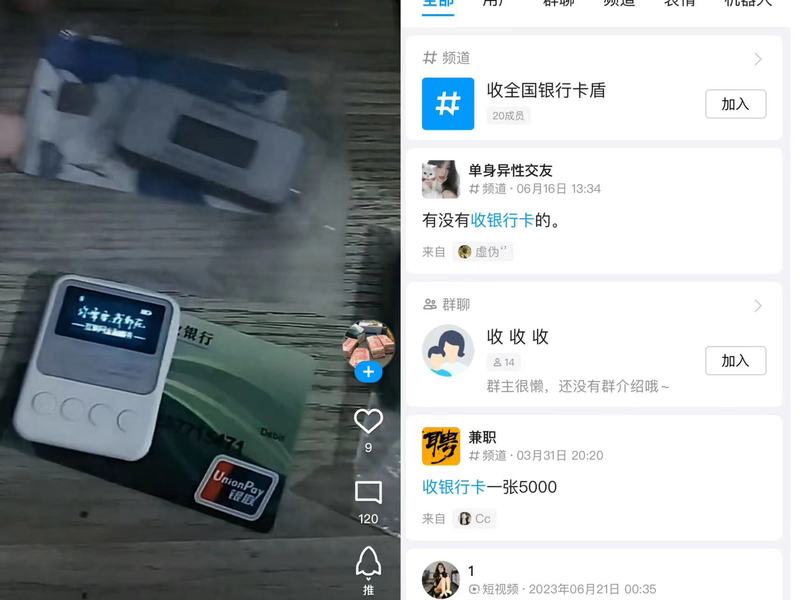 在QQ平台上,搜查“收银行卡”字样,即可看到多个相关信息,有的明码标价,有的经由视频揭示“商品”。