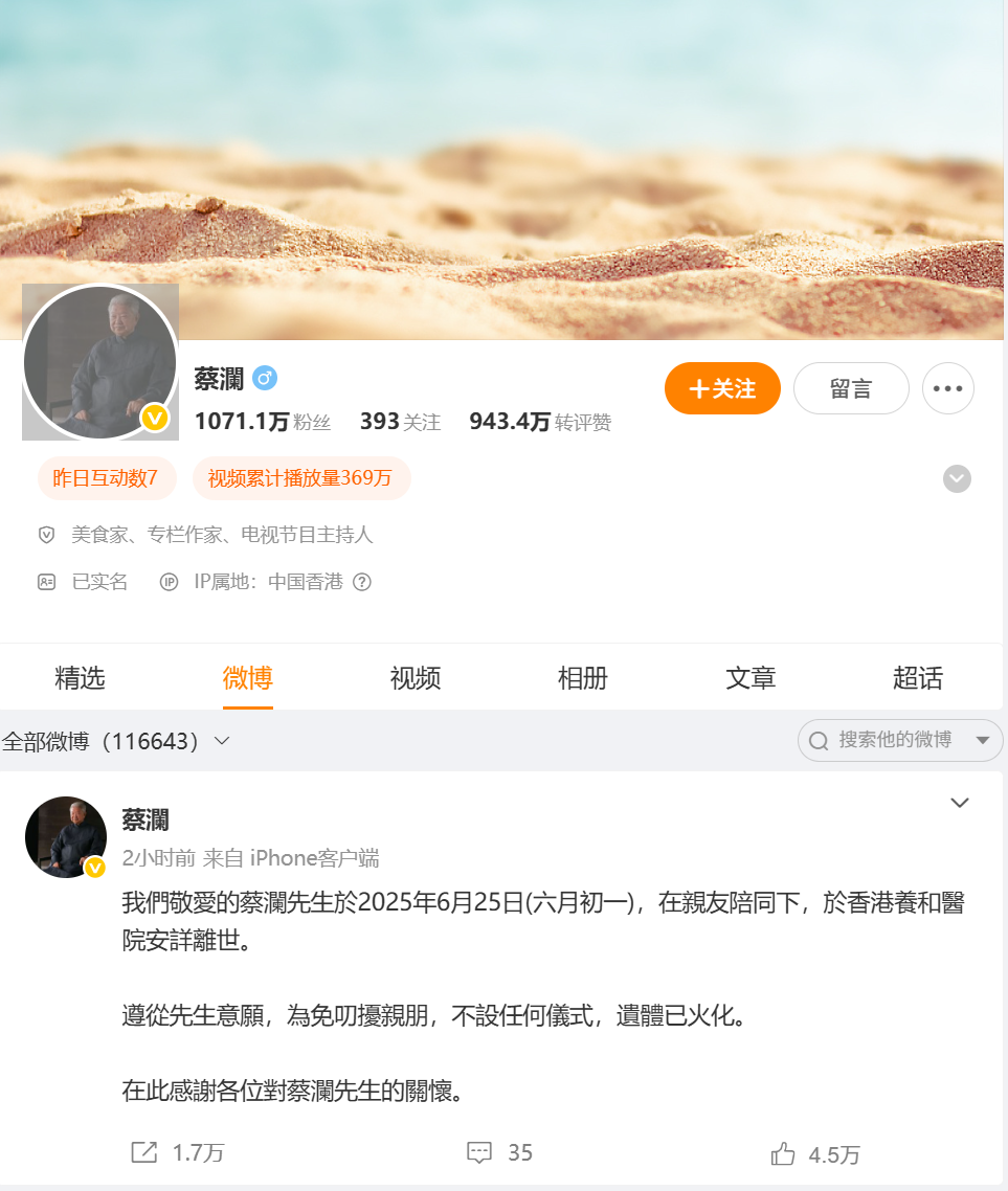 蔡澜认证微博截图。