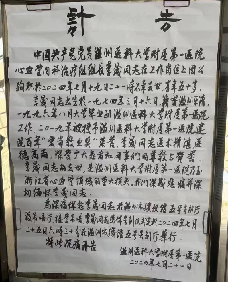 “李晟1974年3月16日生于温州乐清,享年50岁,1996年大学结业到温州医科大学隶属第一医院使命至今,现任温州医科大学隶属第一医院血汗管外科治疗组组长。2019年被给予温州医科大学隶属第一医院建院百年‘爱岗敬业奖’声誉。李晟同志医术广博,品格高尚,深受宽绰广漠豪爽患者以及共事们的恭顺以及表彰。”