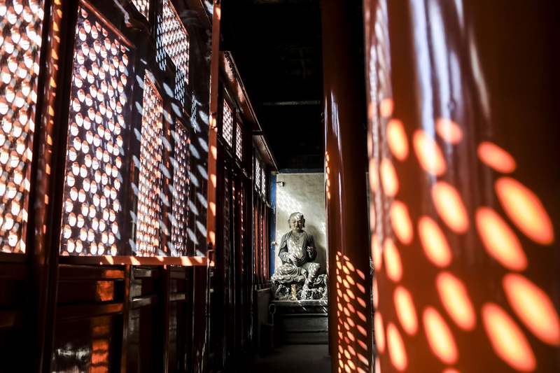 2020年11月12日,万寿寺中路大雄宝殿,一座罗汉木雕造像洗浴在阳光里。最新往事记者 浦峰 摄