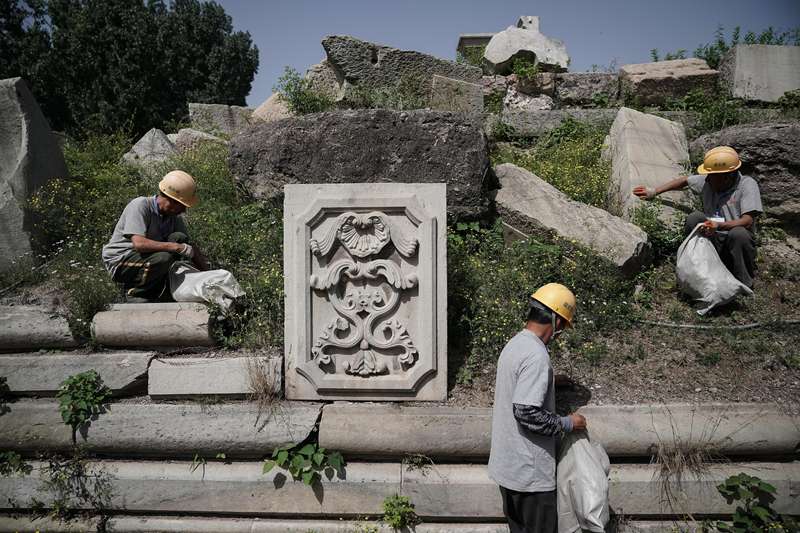 2018年5月23日,圆明园遗迹公园启动远瀛不美不雅、急流法救命呵护工程。图为工人们拦阻根除了杂草使命。图/视觉中国
