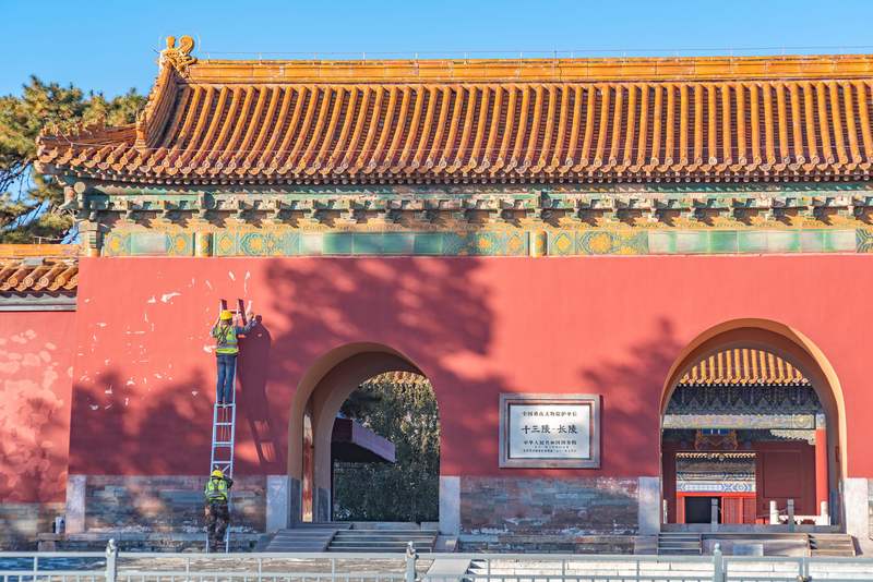 2021年10月26日,北京明十三陵长陵景区,长陵大宫门拦阻文物补葺,文物古建补葺使命者在拦阻墙体外立面的补葺使命。图/视觉中国