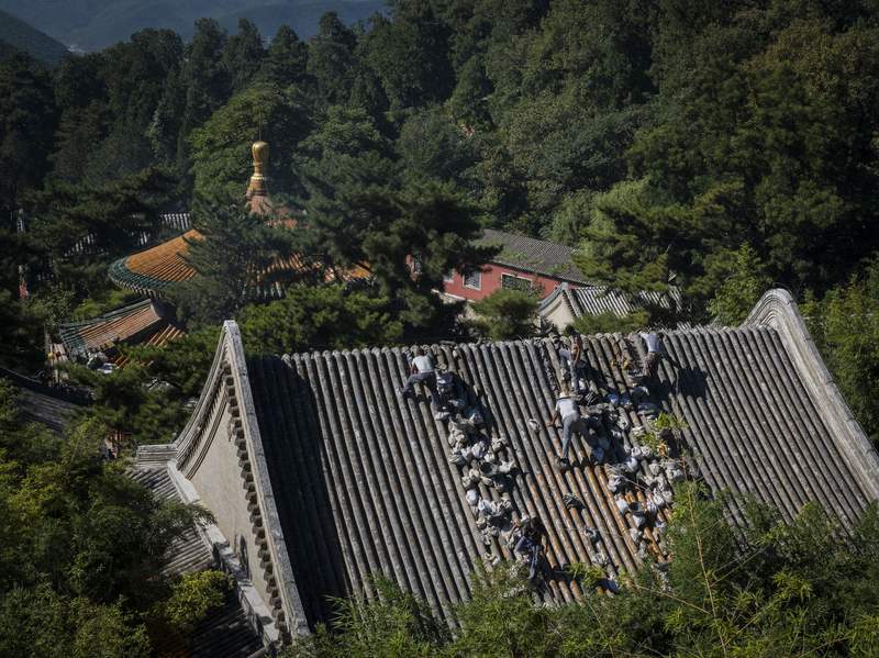 2017年8月6日,潭柘寺,工人在大殿顶上培修。图/视觉中国