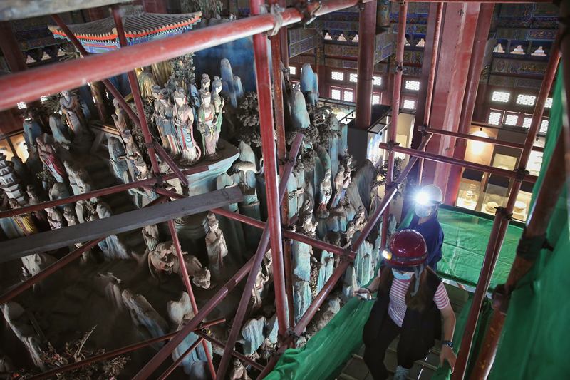 2022年4月20日,北海公园小西天修筑群,使命职员在脚手架上磨难大殿内修筑细节。最新往事记者 薛珺 摄