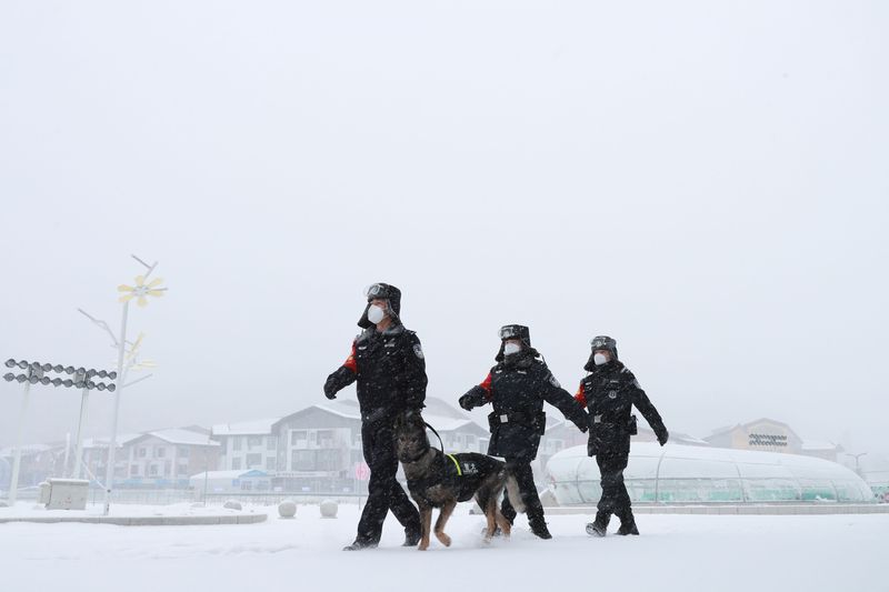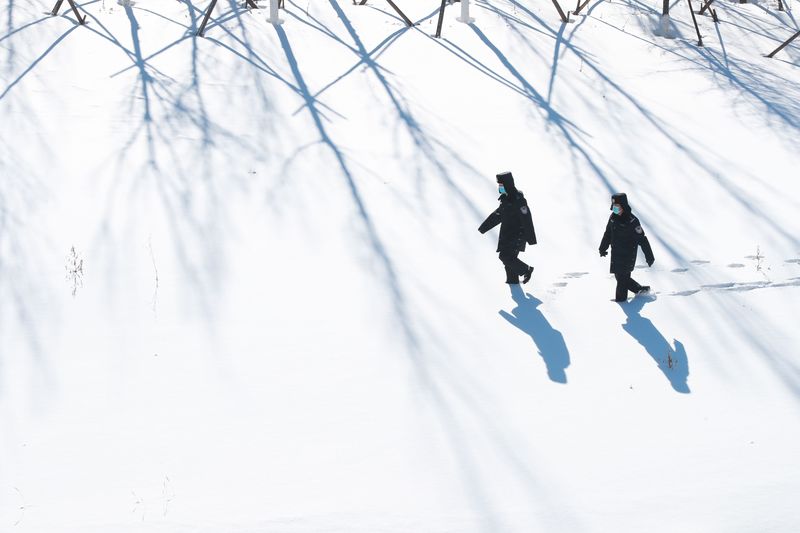 北京冬奥会时期,铁警冒雪在太子城站站前广场执勤。北京铁路公安处供图