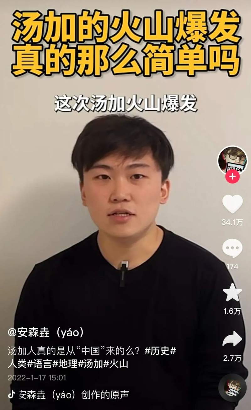 全网粉丝突破700万的安森垚分解说,这条视频之以是可能受到招待,次若是由于汤加、火山这两个关键词。“汤加人所属的南岛族群,其祖先很可能与中国浙江宁波的河姆渡遗迹存在千头万绪的关连,这可能是受众的痒点;超大火山爆发后,从天下史角度看,火山熏染很可能激发天下性的王朝兴衰,这是痛点以及爽点。”