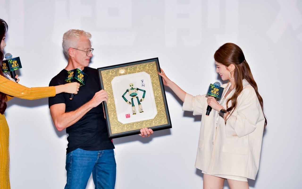 以动画为动身点,陈昊宇一起追溯我国配合的动画艺术,为导演送上了“萝斯”皮影,实现一出货物方动画艺术的逾越时空碰撞。桑德斯表白谢谢以及喜爱的同时更是逗趣夸诞:“我会把它挂在咱们使命室的墙上,可是见告每一总体这是独属于我的。”而后,作为受礼,桑德斯导演现场亲手绘制起萝斯、小布点儿、芬克的合家福。短短多少多分钟之内,导演妙笔作画,将片中三个灵魂人物勾勒患上活迅速现。作为这幅珍贵画作的收礼人,陈昊宇揭示:“不要羡慕,这是我的。”与导演此前的回覆组成照应。