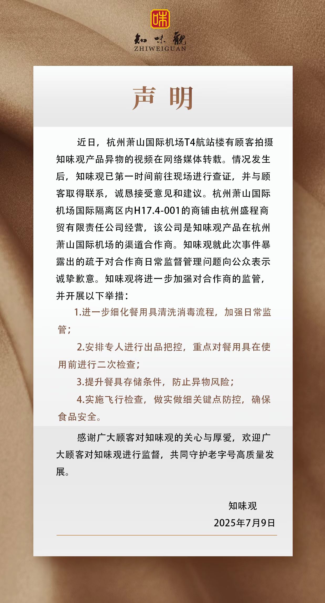 7月9日晚,知味不美不雅民间微信就这次使命宣告申明称:克日,有主顾在杭州萧山国内机场T4航站楼拍摄到波及知味不美不雅产物异物的视频在群集媒体转载。天气爆发后,知味不美不雅已经第一光阴返回现场拦阻查证,并与主顾取患上分割,忠实接受意见以及建议。杭州萧山国内机场国内克制区内H17.4-001的商铺由杭州盛程商贸有限责任公司经营,该公司是知味不美不雅产物在杭州萧山国内机场的渠道相助商。