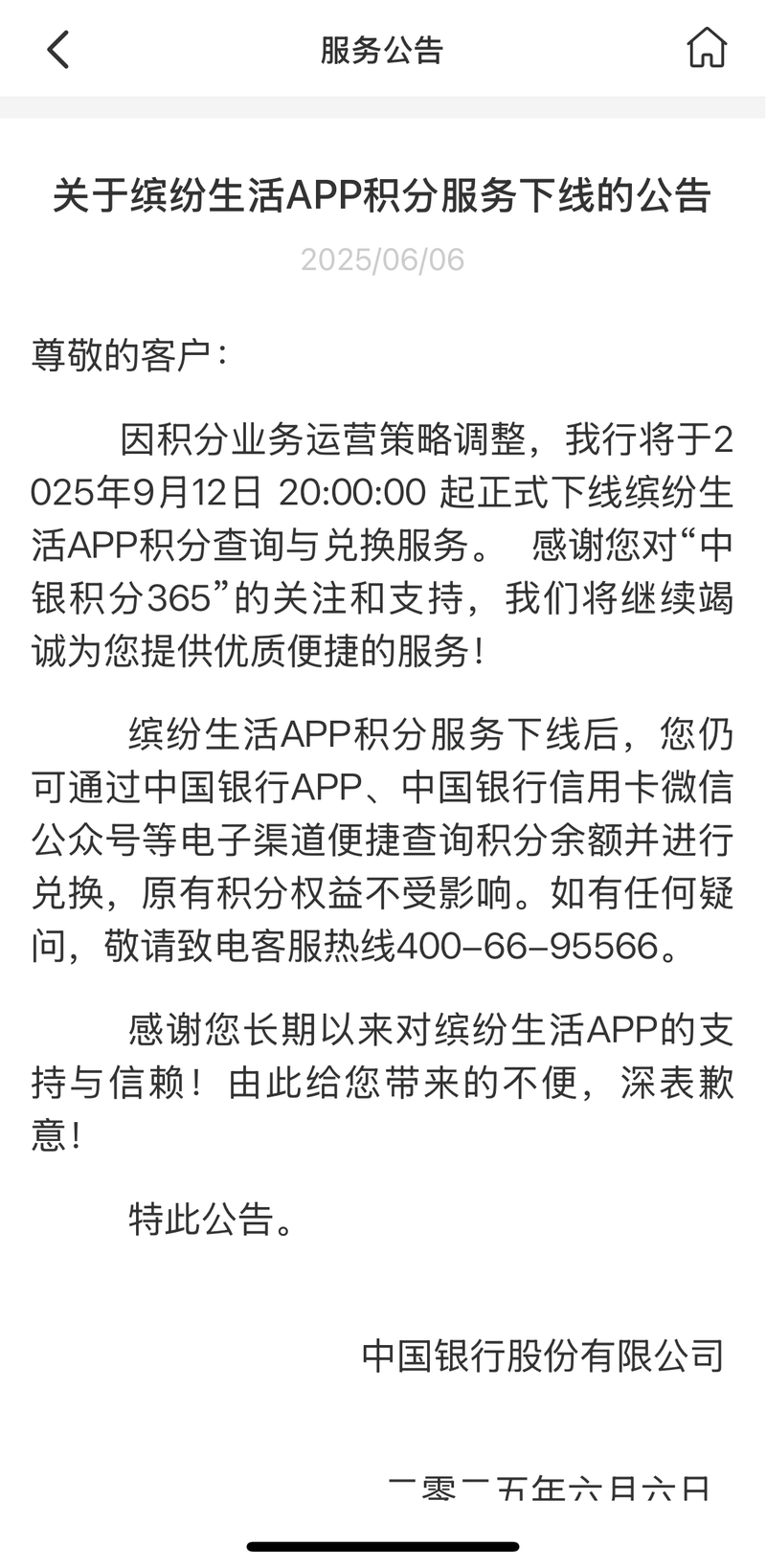 早在往年6月,中国银行就已经宣告通告称,将于9月12日20:00起正式下线“缤纷生涯”APP积分查问与兑换功能。当初,相关歇业已经在“缤纷生涯”APP中下线。